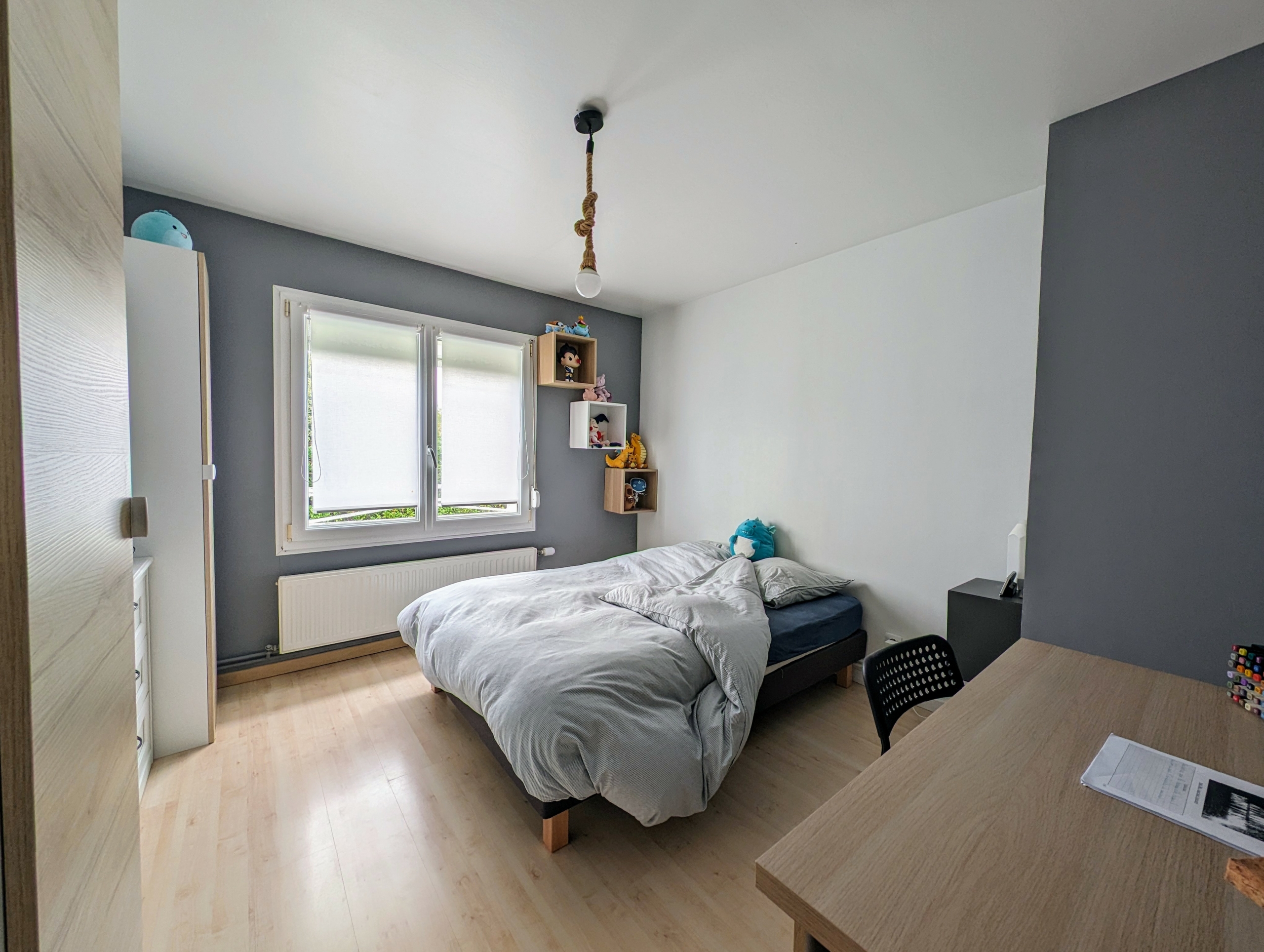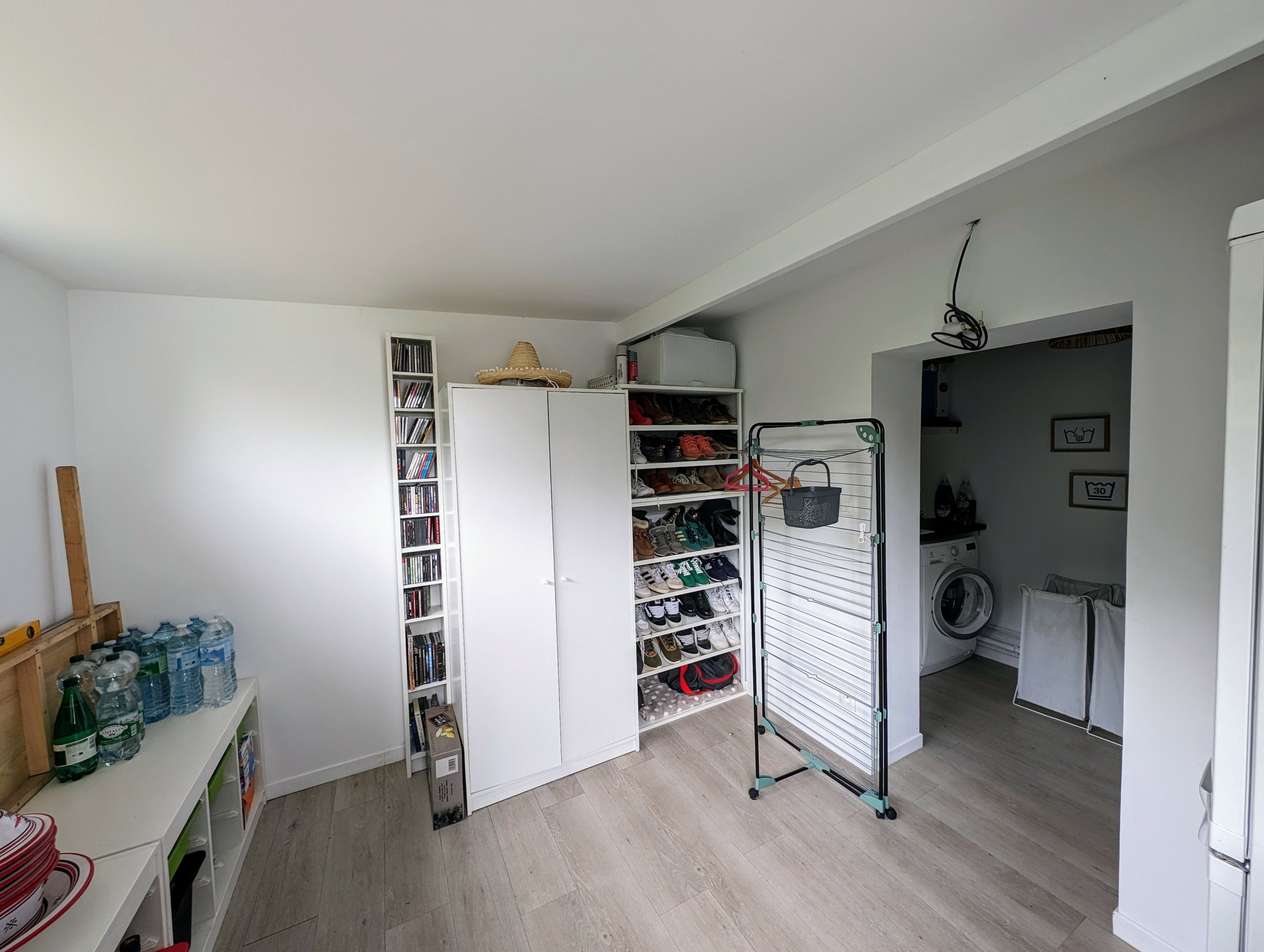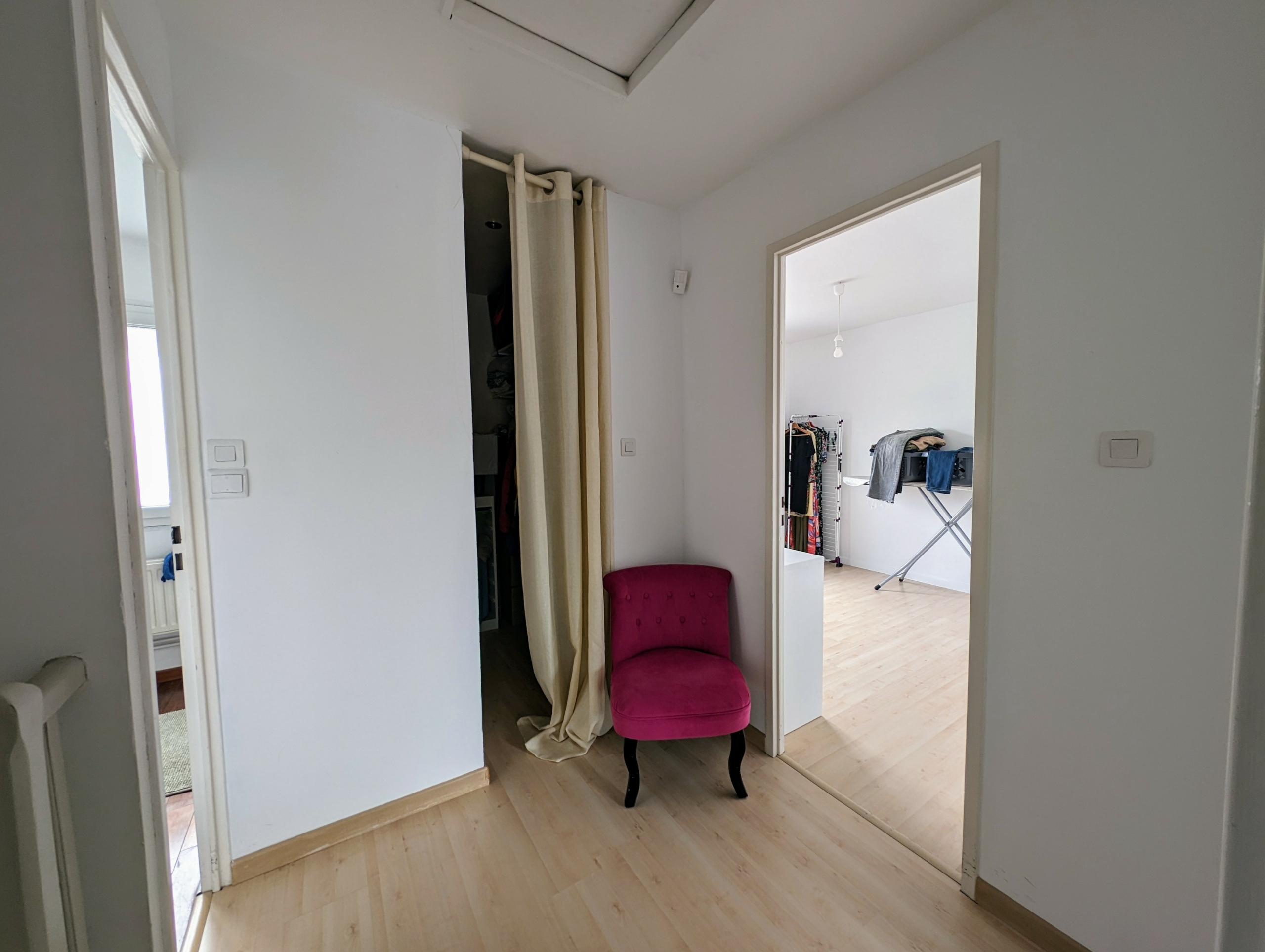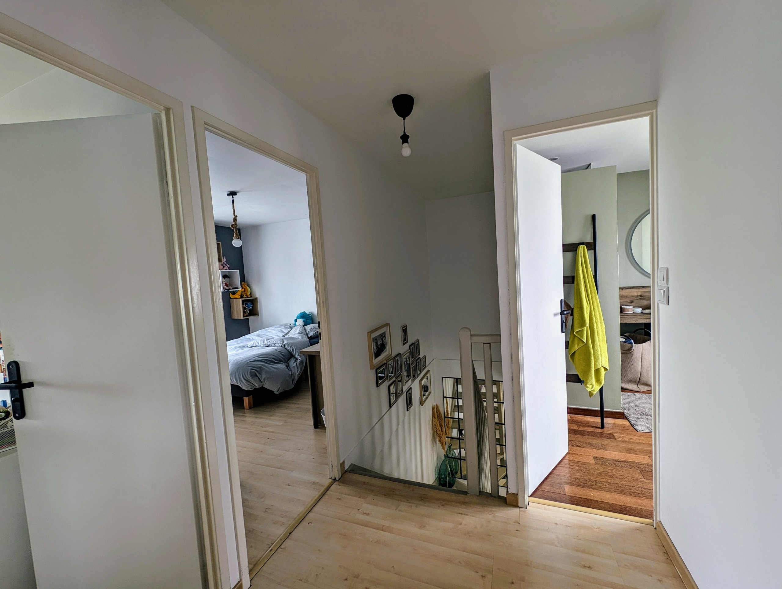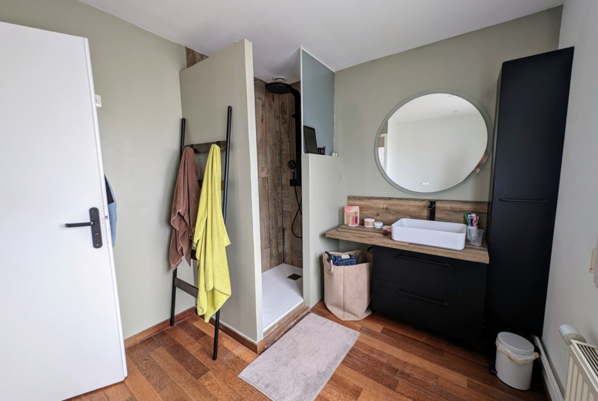 Au premier étage trois chambres et une salle de bains avec douche. Un espace de rangement.