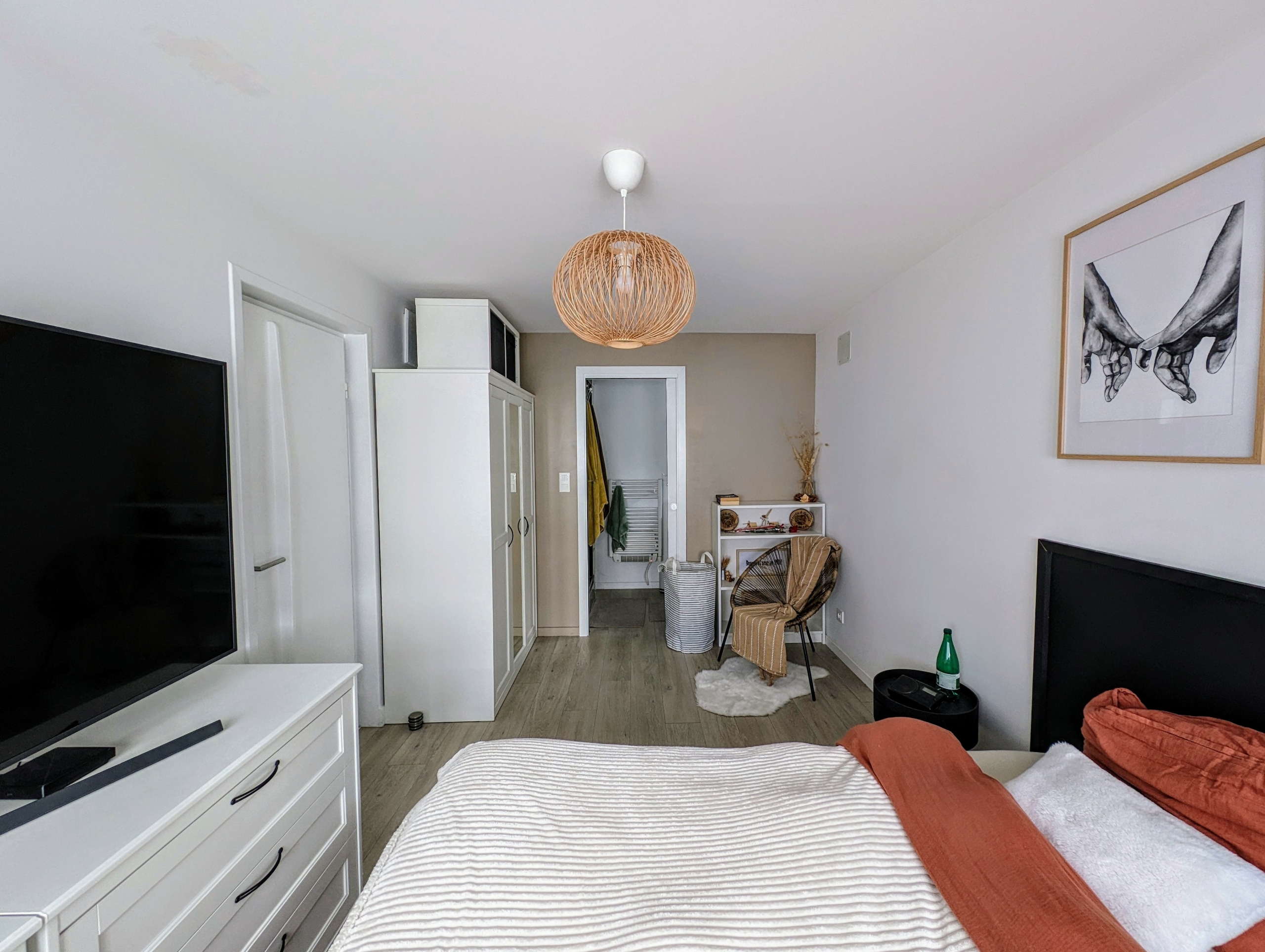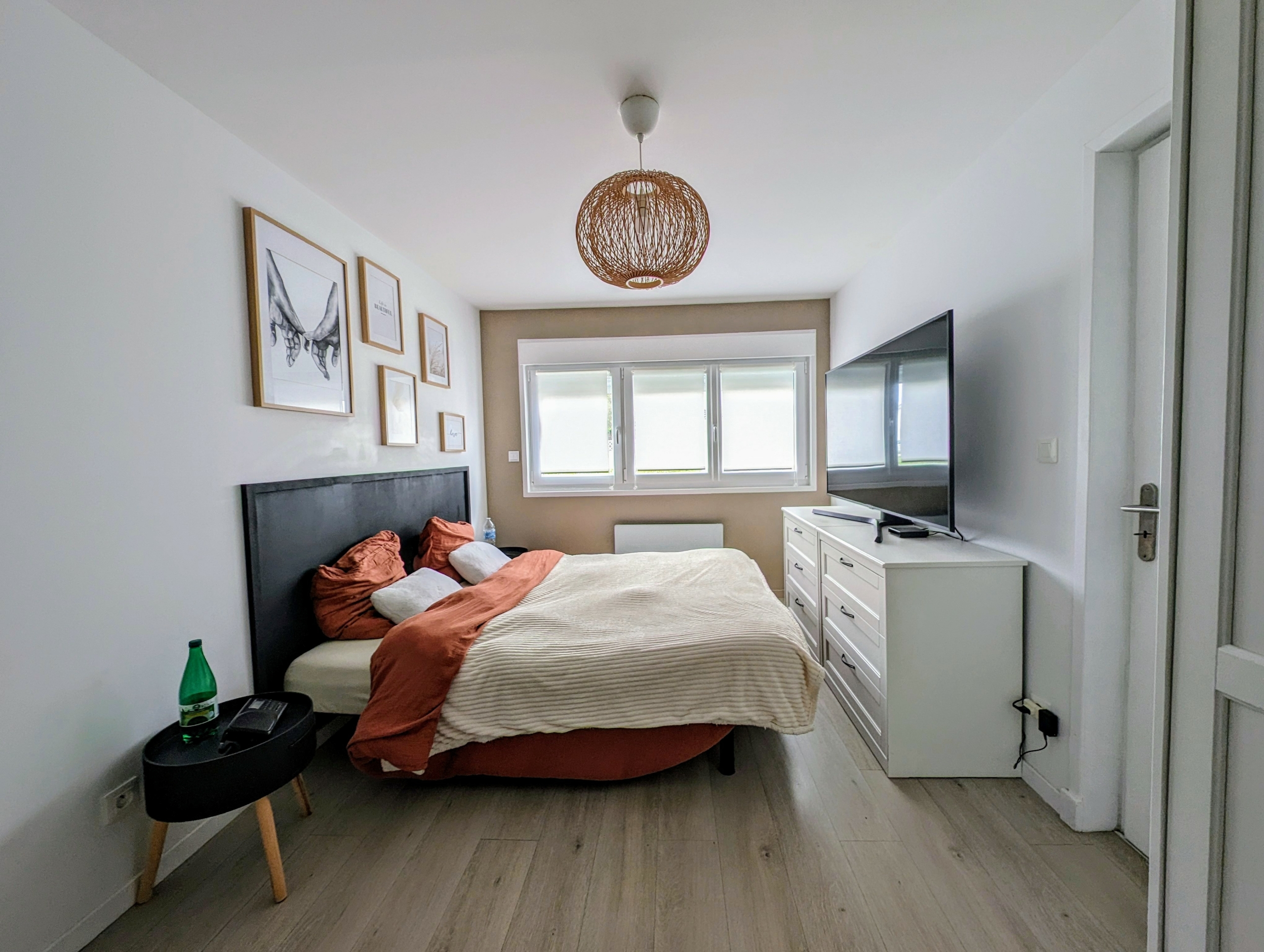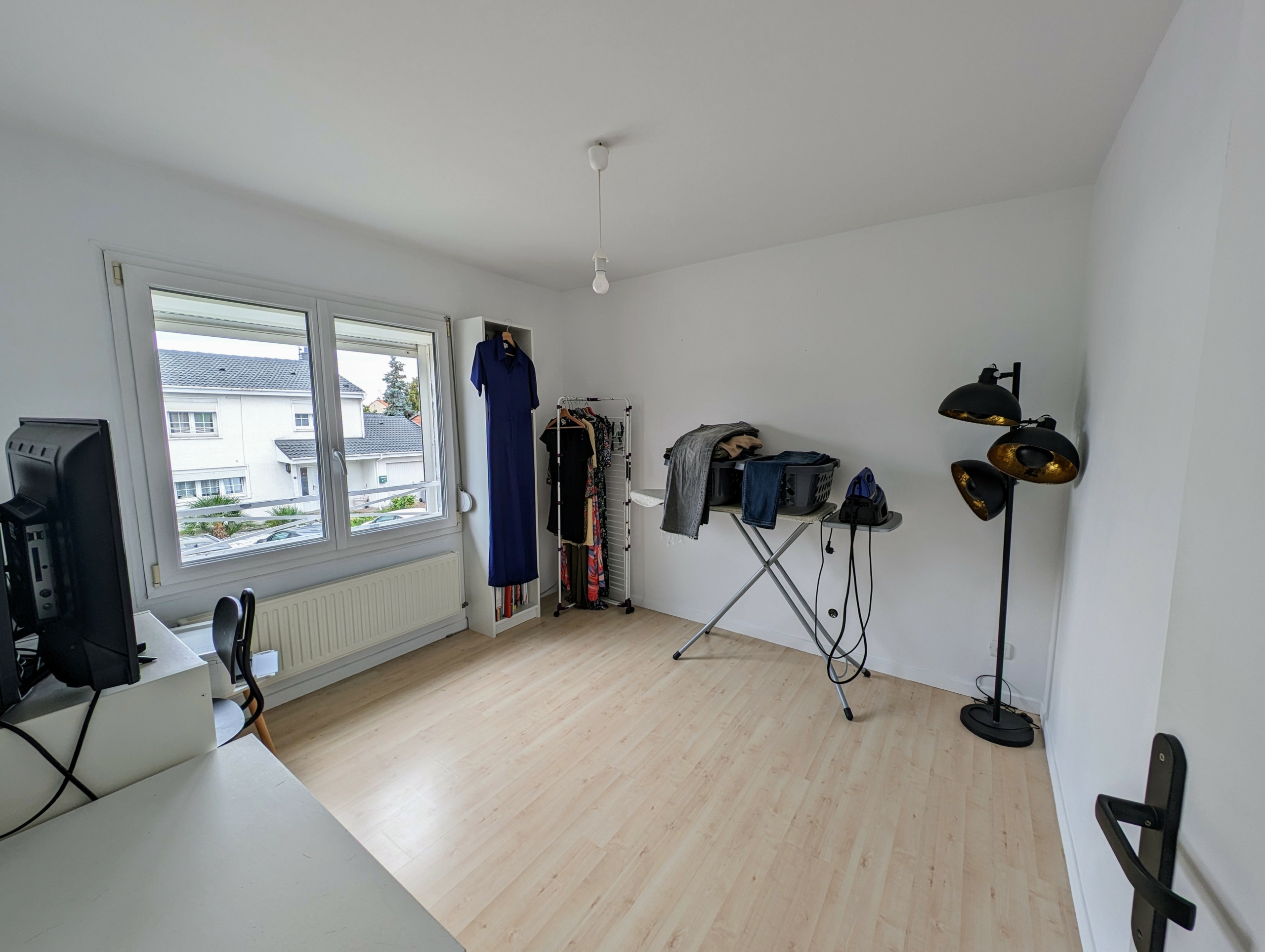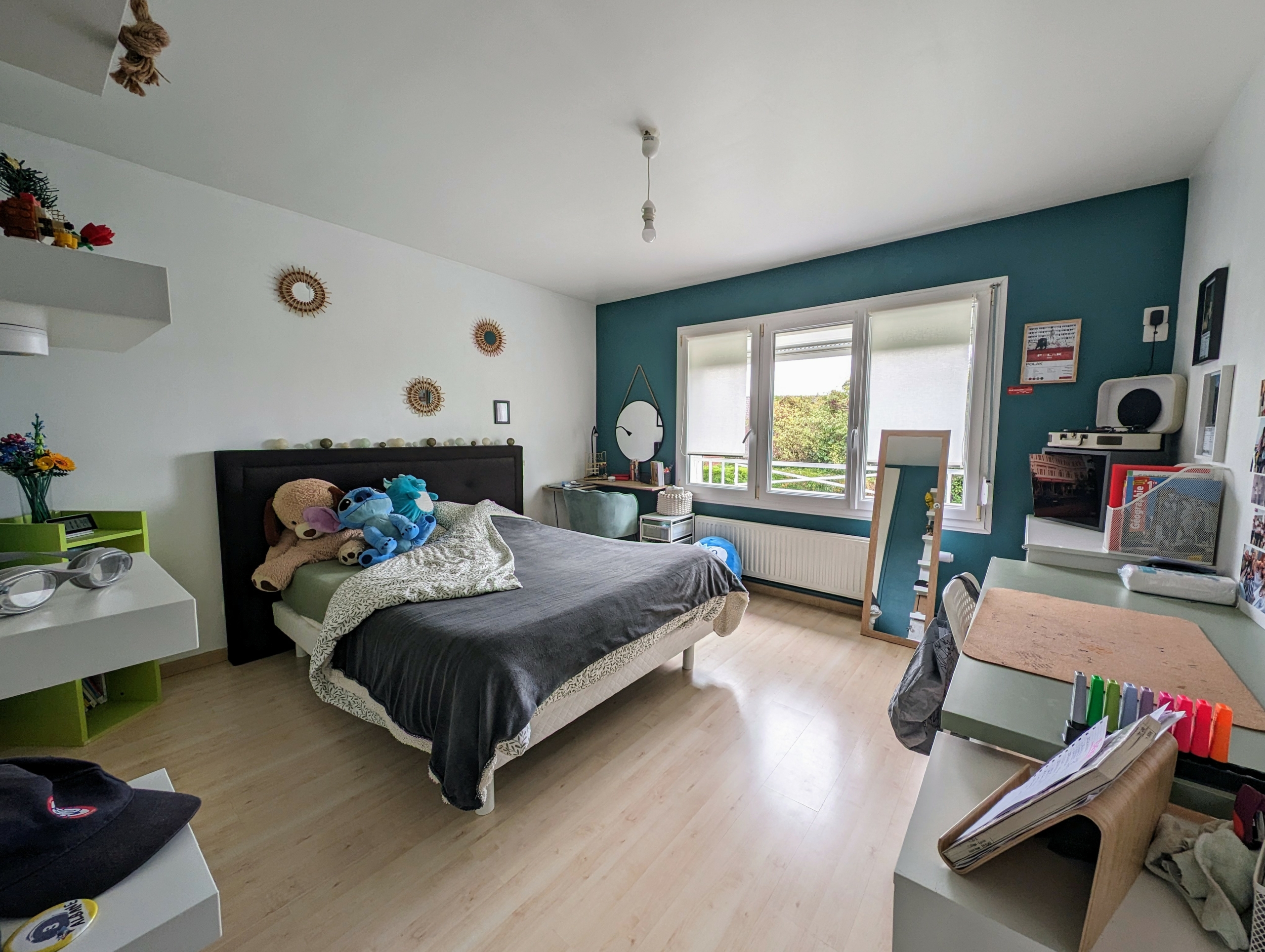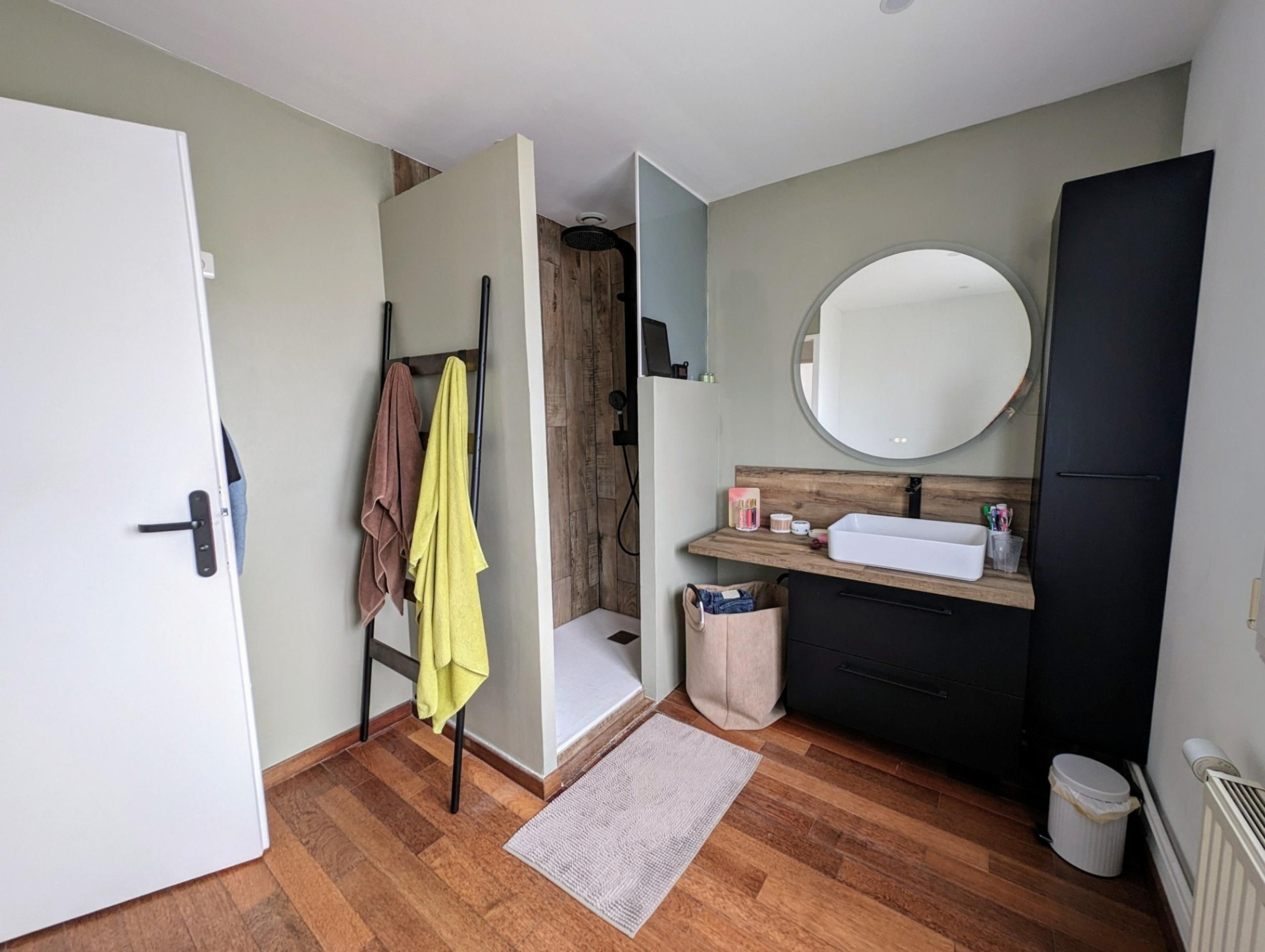 Au premier étage trois chambres et une salle de bains avec douche. Un espace de rangement.